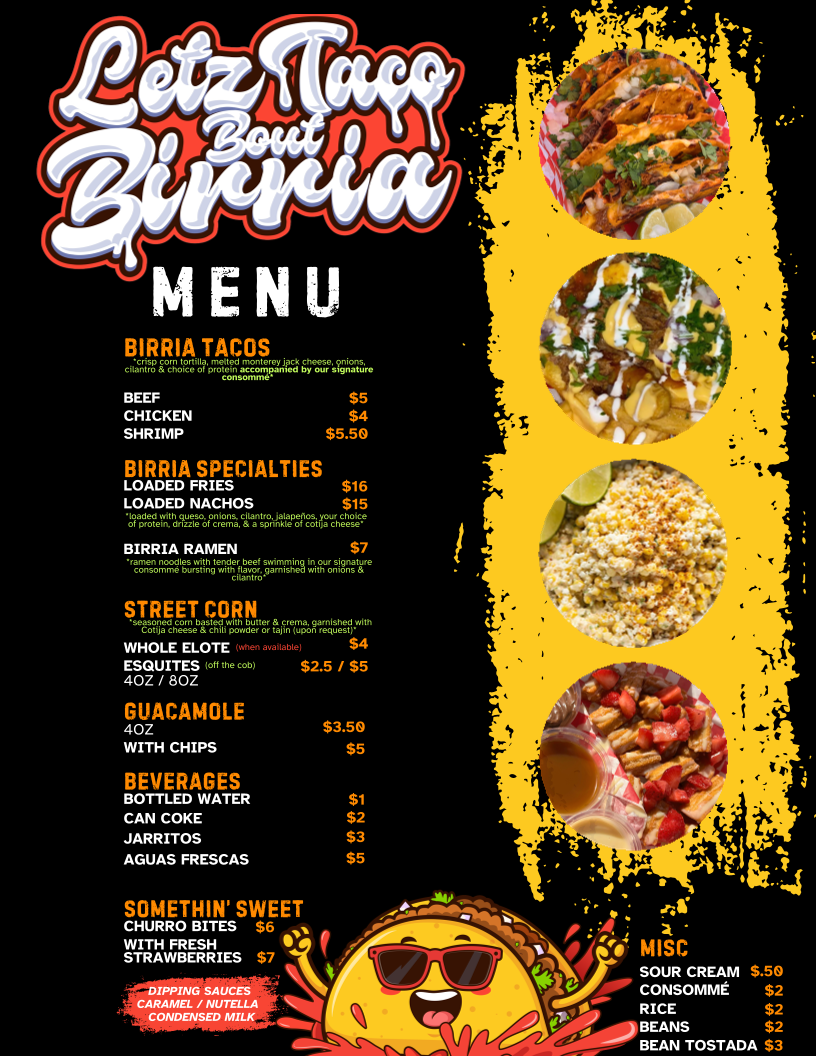 Introducing the menu at Letz Taco Bout Birria, a hidden gem located at 4502 S Babcock St in Palm Bay, FL. This vibrant eatery specializes in authentic birria tacos, inviting food lovers to dive into a world of rich flavors and fresh ingredients. Customers rave about the shrimp tacos, described as "fire," and the beef birria platter, praised for its delicious seasoning and perfect spice level that enhances the overall experience without overpowering the palate.